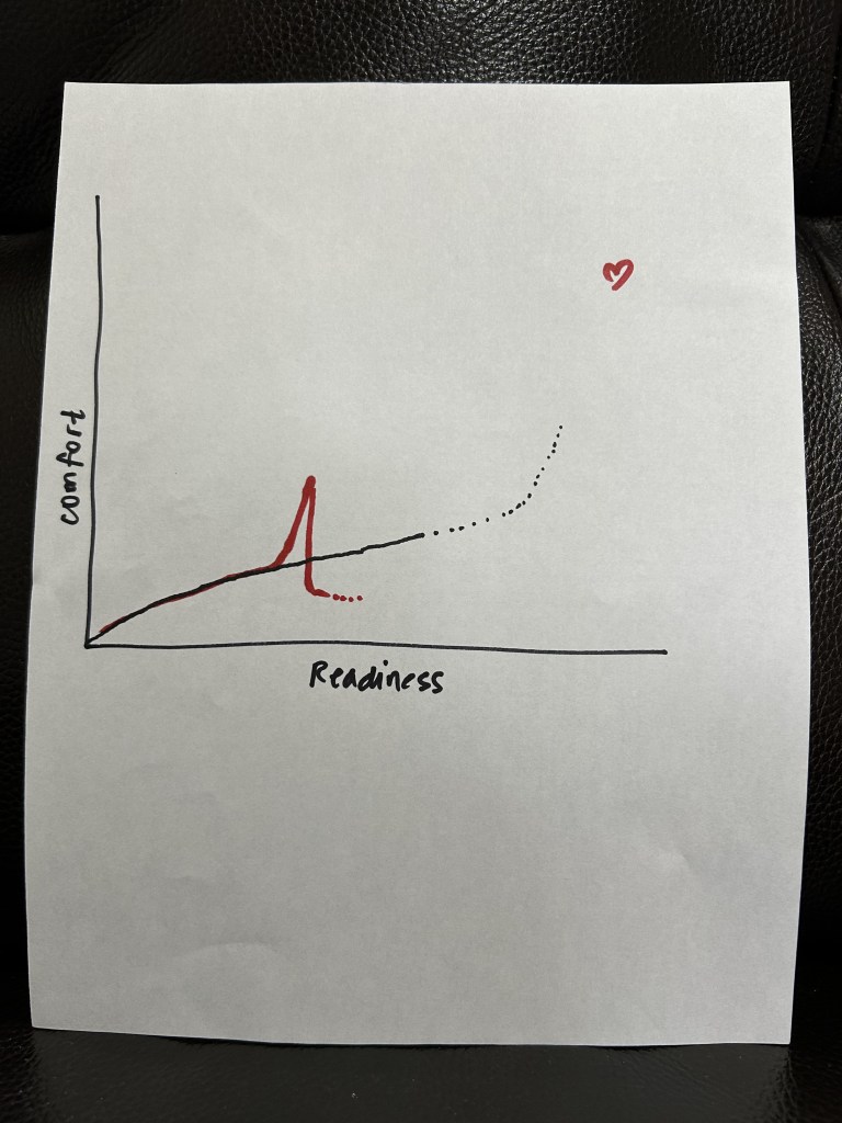 I was on a certain trajectory of readiness (black line) to try and get to some idealized version of comfort, symbolized by the red heart. My friend was trying to walk with me (red line) but perhaps out of overeagerness to move to comfort, jerked the conversation up a trajectory that I simply wasn’t ready for, and my heart felt the disconnect immediately. I couldn’t move up so fast on this trajectory with my friend, and we needed time in the conversation for them to also catch me up on their life, so I had to shut down this portion of the conversation.